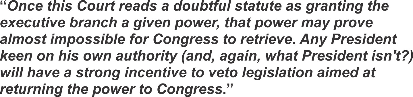 He goes on to caution the court that the problem they cause by ceding congressional power may haunt them long into the future.